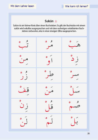 Sukūn ist ein kleiner Kreis über einen Buchstaben. Es gilt: der Buchstabe mit einem
