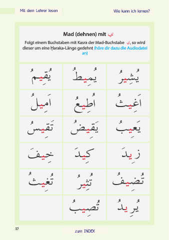 Hausaufgabe: __/__/____ Mad (dehnen) mit Folgt einem Buchstaben mit Kasra der Mad-Buchstabe , so wird dieser um eine Ḥaraka-Länge gedehnt (höre dir dazu die Audiodatei an) 37
