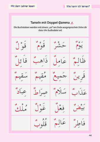 Hausaufgabe: __/__/____ Tanwīn mit Doppel-Ḍamma Die Buchstaben werden mit einem „un“ am Ende ausgesprochen (höre dir dazu die Audiodatei an) 44