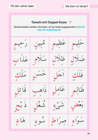 Hausaufgabe: __/__/____ Tanwīn mit Doppel-Kasra Die Buchstaben werden mit einem „in“ am Ende ausgesprochen (höre dir dazu die Audiodatei an) 46