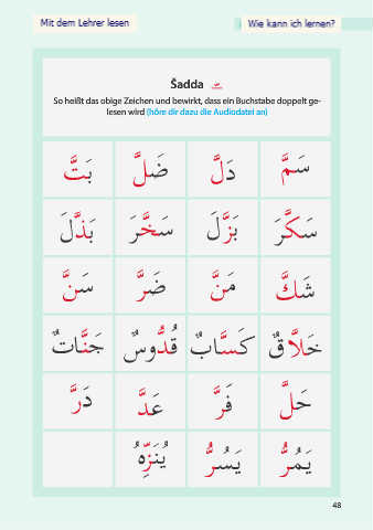 Hausaufgabe: __/__/____ Šadda So heißt das obige Zeichen und bewirkt, dass ein Buchstabe doppelt ge- lesen wird (höre dir dazu die Audiodatei an) 48