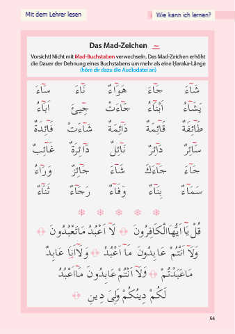 Hausaufgabe: __/__/____ Das Mad-Zeichen Vorsicht! Nicht mit Mad-Buchstaben verwechseln. Das Mad-Zeichen erhöht die Dauer der Dehnung eines Buchstabens um mehr als eine Ḥaraka-Länge (höre dir dazu die Audiodatei an) 54
